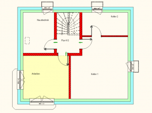 Im Kellergeschoss mit einer Nutzfläche von ca. 65 m² liegen zwei Keller, ein Arbeitszimmer und der Haustechnikraum. Im Haustechnikraum befindet sich die hocheffiziente Lüftungsanlage mit Wärmerückgewinnung. Ein Luft- Erdwärmetauscher sorgt an heißen Sommertagen für angenehm frische Luft und an kalten Wintertagen für die Vorerwärmung der Zuluft. Eine Sole/Wasser-Wärmepumpe ist für die Restheizlast und warmes Wasser zuständig.