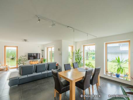 Im Erdgeschoss mit ca. 97 m² Wohnfläche befindet sich ein Windfang mit Garderobe. Durch die Diele gelangt man in die offene Küche mit separater Speis. Gleich daneben ist der Wohn- und Essbereich, der ebenfalls einen direkten Zugang zur Diele ermöglicht. Im Osten ist das WC und das Büro untergebracht. Die Terrasse, die sich auf dem Dach der Garage befindet, ist ein toller Blickfang.