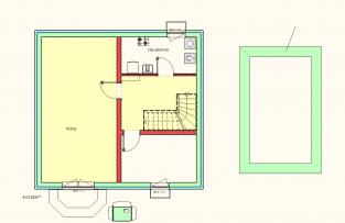 Im Erdgeschoss, mit rund 60 m² Wohnfläche, befindet sich am Eingangsbereich eine Garderobe, gleich daneben ein kleines WC mit Dusche. Im linken Teil des Hauses liegt der Wohn- und Essbereich, durch die Schiebetür gelangt man vom Essbereich in die abgetrennte Küche. Die Küche ist auch über die Diele zu erreichen.