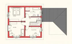 Durch die elegante Stahl-Holztreppe kommt man in das Obergeschoss mit ca. 59 m² Wohnfläche. Dort befinden sich ein Kinderzimmer, ein Schlafzimmer, ein Gästezimmer und ein großes Badezimmer mit Badewanne, WC, Waschbecken und begehbarer Dusche.