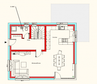 Das Erdgeschoss hat eine Wohnfläche von ca. 71 m². Hier befindet sich eine Diele mit einer Nische für den Platz einer Garderobe, ein kleines Gäste-WC mit Dusche und ein großer Wohn- und Essbereich mit offener Küche.