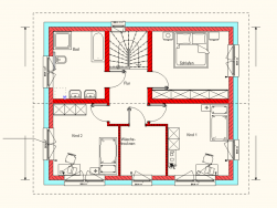 Durch die elegante Stahl-Holztreppe gelangt man ins Obergeschoss mit rund 68 m² Wohnfläche. Hier ist das Schlafzimmer, zwei Kinderzimmer, ein Raum, um die Wäsche zu trocknen und das Badezimmer mit zwei Waschbecken, WC, Dusche und Badewanne untergebracht.