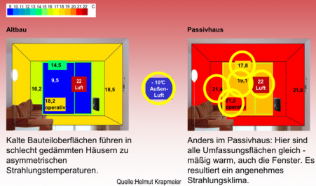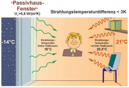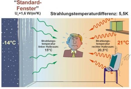 Unser Behaglichkeitsempfinden wird von der Differenz der Oberflächentemperaturen der uns umgebenden Bauteile (Wände, Fenster, Decke, Boden,...) maßgeblich beeinflusst.